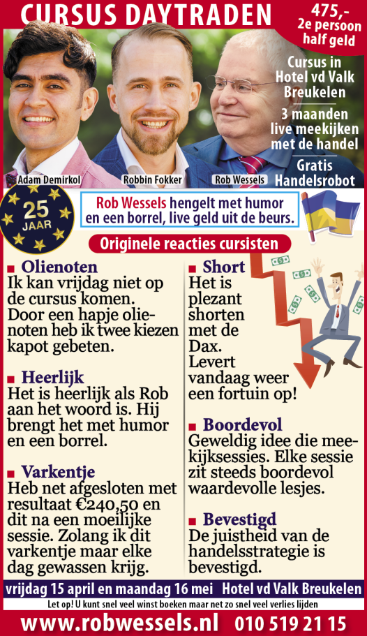 Als u het vak van trader wilt leren, hoeft u niet direct veel geld te investeren. We gaan eerst een paar weekjes oefenen met een zogenaamd demo-account. Daarna begint u pas met echt geld dat u eventueel langzaam kunt opvoeren naarmate uw ervaring toeneemt. Ik blijf u daarbij ondersteunen. Natuurlijk is traden met een demo-account niet hetzelfde als wanneer u met uw eigen geld zou traden, maar u leert in ieder geval meer dan wanneer u eerst helemaal niet zou oefenen.